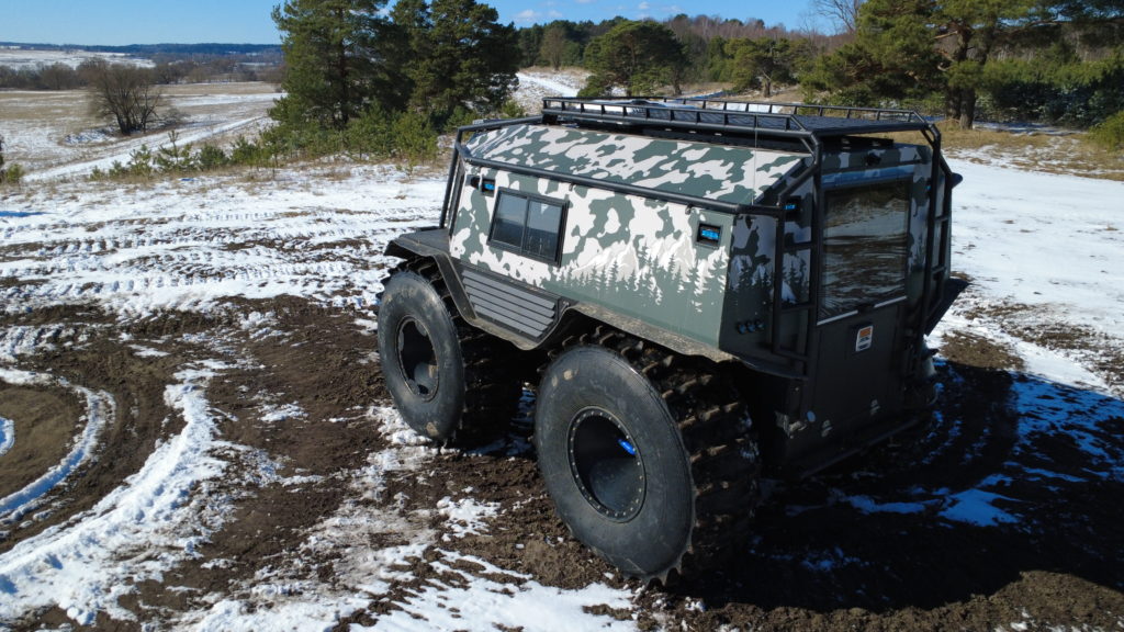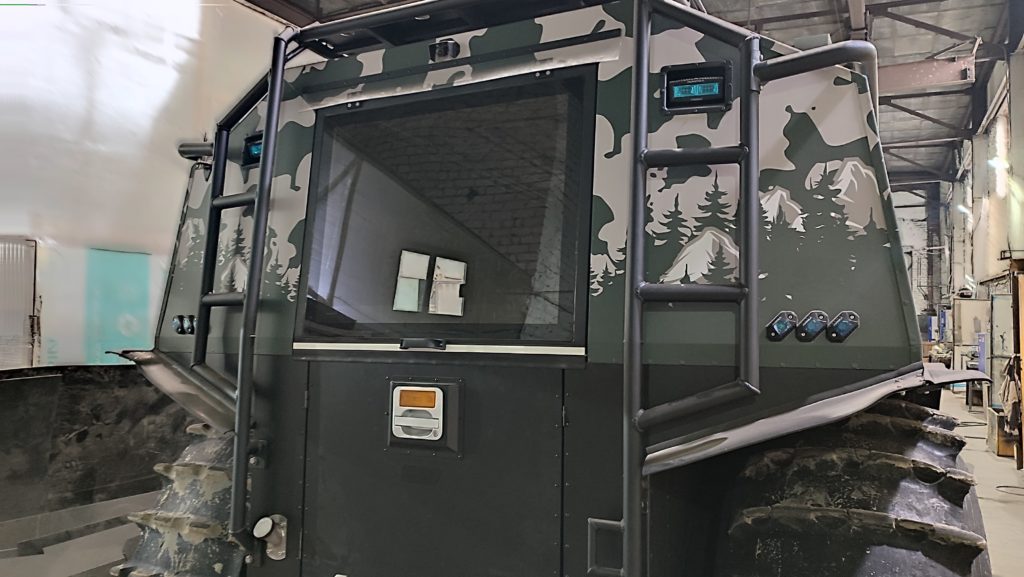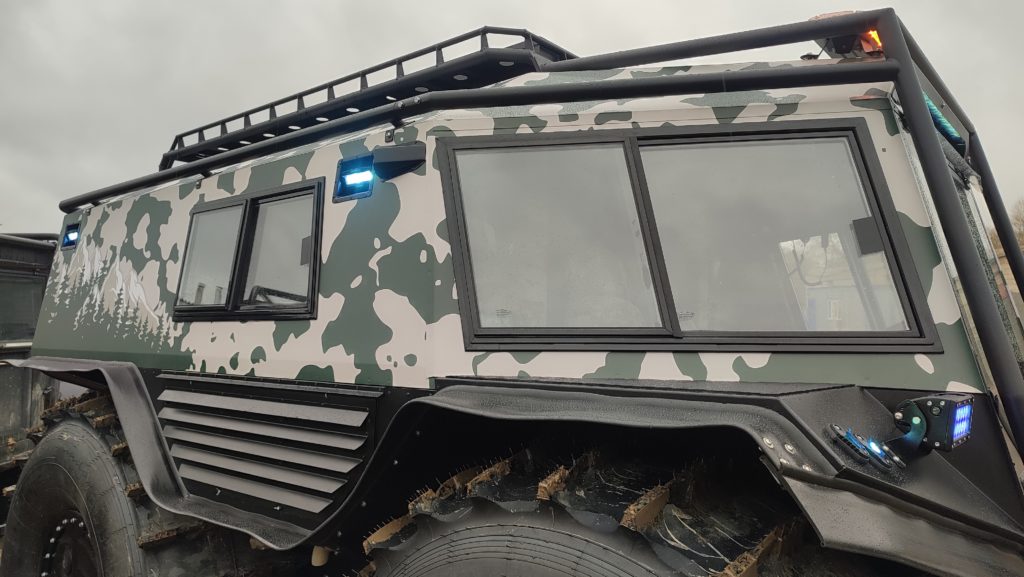 На каждом колесе стоят колёсные редуктора (снижают нагрузку на цепи в 4 раза). Поворот осуществляется фрикционом газ 71. Коробка DUSTER 6 скоростей. Двигатель расположен продольно, передача момента от коробки на фрикцион через кардан. На бортах стоят цепи (Япония). Топливный бак либо 130 либо 150 литров. Центральная подкачка выхлопными газами, 4 колеса соединены между собой. Поворот осуществляется штурвалом. Защитный каркас безопасности ROPS металл. Алюминиевый экспедиционный багажник. Люк в кабине и кунге. Фары рабочего света на крыльях Aurora. Противотуманные фары в Rigid. Адаптивная балка света встроена в кабину Aurora. Боковое освещение Aurora. Задние освещение Aurora. Высокопрочные поворотники и габариты. Светодиодное освещение кунга и кабины. Камеры бокового обзора с раздельными мониторами. Камера заднего вида отдельный монитор. Автономный отопитель Eberspacher airtronic 2 квт. Помпа в трюме, для аварийной откачки воды. Магнитола с колонками. Преобразователь 12-220 на 1,5 кв с розеткой в салоне. Лобовое стекло с обогревом. Окна в кунге открываемые с москитными сетками и тепловыми шторами. Лебедка Goldenpower EWB9500SR тяга 4309кг скоростная, синтетический трос 25 метров. Звуковой сигнал. Омыватель лобового стекла. Обшивка салона тканью CORDURA® цвет мультикам. Тепло шумо виброизоляция. Система Molle для крепления различных подсумков и аксессуаров в салоне. Полки. Usb розетки. Алюминиевые такелажные рейки для крепления груза в салоне. Поручни в салоне. Обогрев топливной системы. Спальные и сидячие места в кунге на выбор. Передние кресла регулируются по углу и по вылету. Мощная тосольная печка кабины. Электрический вентилятор на радиатор охлаждения ( автоматический с возможностью ручного управления). Рация Yaesu FT-7900R мощность 50 Вт, с антенной. Коврики ЭВА в салоне. Рундук в полу для хранения вещей. Автоматическая система пожаротушения моторного отсека. LiFePo4 аккумуляторы 2 шт. от VistaBattery, стартовый 40А серии Trophy и стартово-тяговый 100А серии Discovery