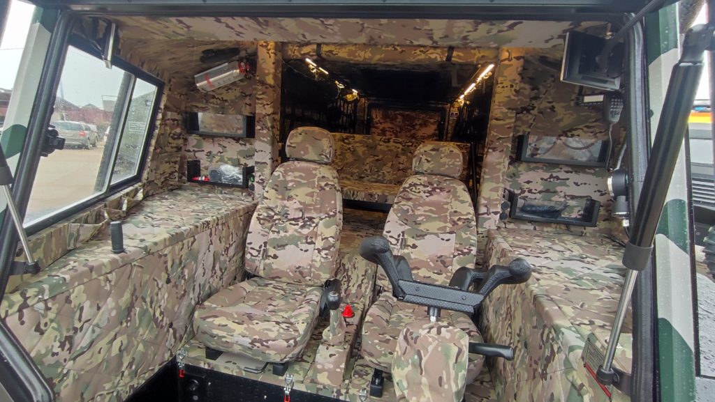 Пассажирские места в кунге легко трансформируются. Можно обустроить большое ровное спальное место габаритами 230 на 230, можно модифицировать его в П-образное спальное место. Кунг оборудован отопителем Eberspacher , внутри отличное и приятное глазу освещение, качественная аудиосистема. Предусмотрены удобные поручни для пассажиров, такелажные рейки, система «Molle» для крепления грузов, имеются удобные полки, USB розетки, а также стандартная розетка на 220 в. Люк и боковые окна оснащены съемными москитными сетками, также присутствует шторка отделяющая кунг от кабины. Пол застелен эво ковриком. Запас топлива в стандартном баке 130 литров. По выбору заказчика может устанавливаться увеличенный бак на 160 литров. система обогрева топлива в базовой комплектации. Помимо этого, есть возможность установки еще 4-х дополнительных баков в дисках колес.